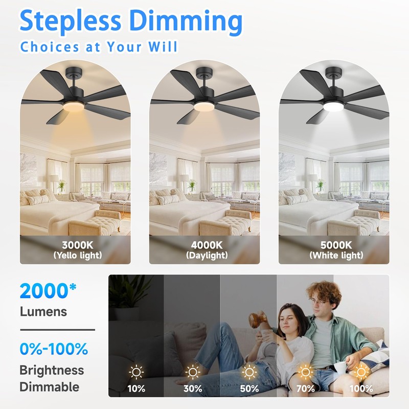 - 【Color-Changing & Dimmable LED Lights】Our 52 inch ceiling fan with app control features energy-efficient, color-changing LED lights with 3 modes: 3000K warm yellow, 4000K bright daylight, and 5000K cool white. Adjust brightness from 0% to 100%, ideal for work, relaxation, or parties. With 2000 lumens, it provides ample light for large spaces like master bedrooms. All functions, including color temperature control, can be managed via the remote or app for a customizable experience