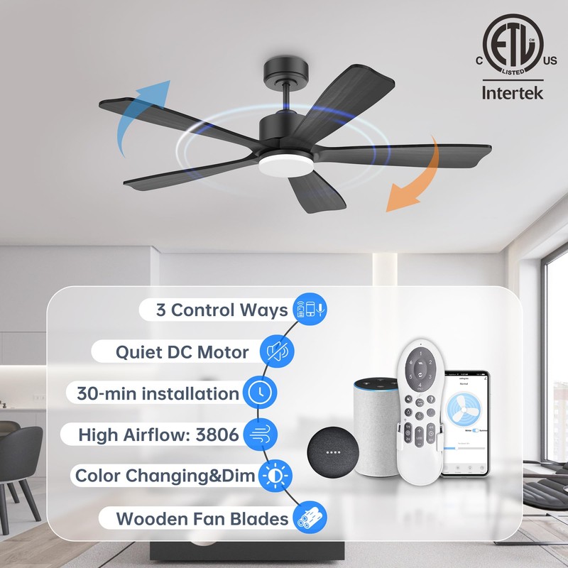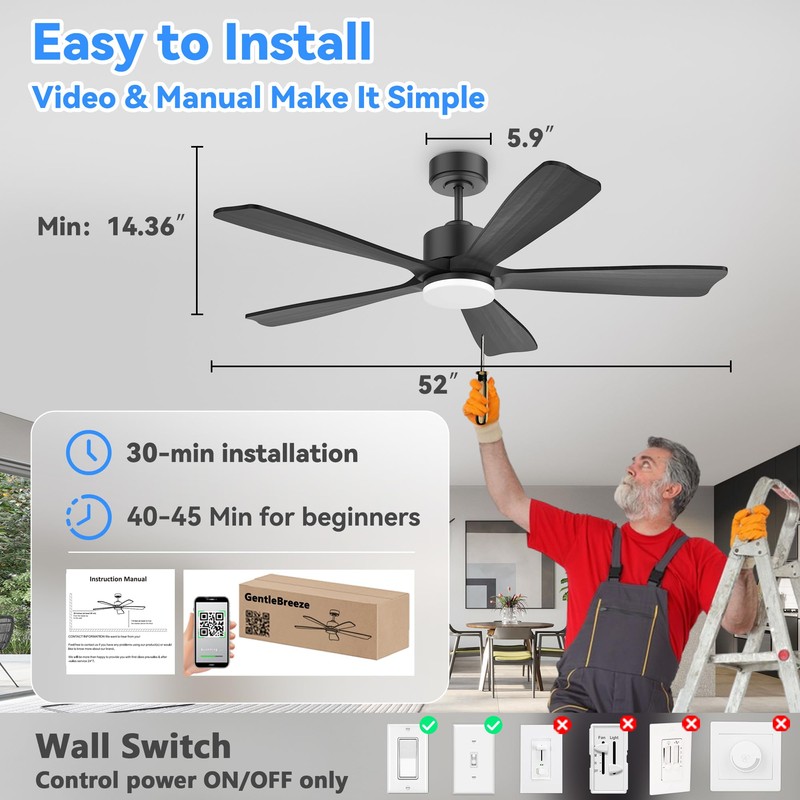 GentleBreeze 52" Wood Smart Ceiling Fans with Lights Remote,Voice Control via WIFI Alexa App,6 Speed Reversible Quiet DC Motor,Dimmable,Black Modern Outdoor Indoor Ceiling Fan for Bedroom Patio Porch