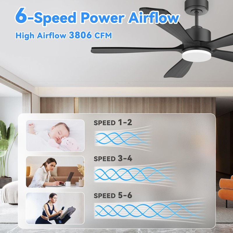 - 【6 Adjustable Speeds, Reversible Quiet Motor & Timer】The 52" outdoor ceiling fan with light offers 6 speeds and powerful airflow up to 3806 CFM. It operates smoothly without wobbling, even at high speed. The reversible motor allows for cooling in summer and warmth circulation in winter. An auto-on/off timer ensures year-round comfort, and the silent DC motor operates at below 30dB, perfect for light sleepers