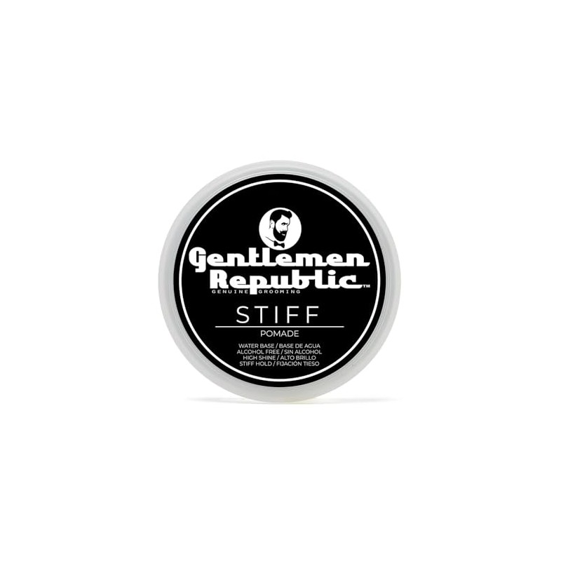 - VERSATILE STYLING: Gentlemen Republic Stiff Pomade is a high shine pomade for men that provides an ultra-strong hold, perfect for polished hairstyles like pompadours, quiffs, and slicked-back looks. Its unique formula ensures lasting control and a brilliant shine, making it ideal for those who demand precision in their grooming routine.