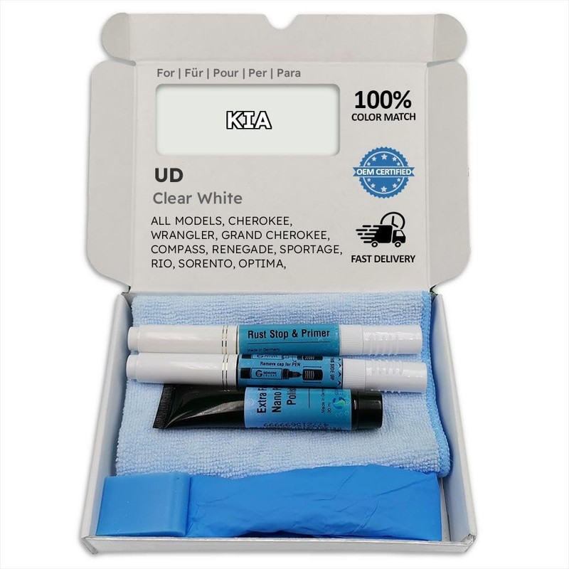 You will receive everything to fix the scratches: primer / rust stoppers, paints, brushes & pen, sandpaper and polish. You can do the correction yourself in minutes.