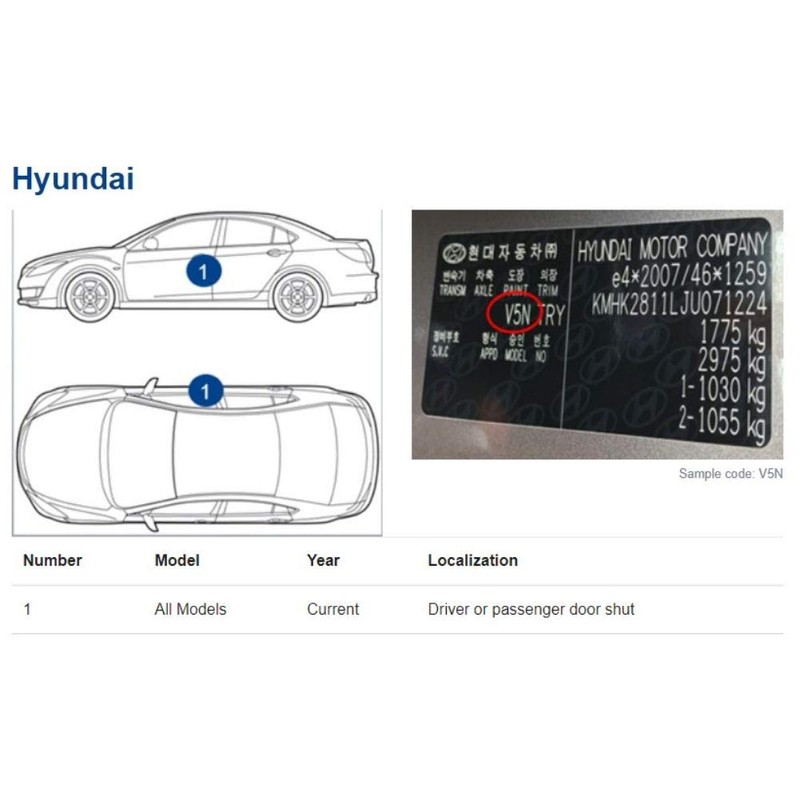 Please check your exact colour code on the vehicle before purchasing. The colour code is on the VIN sign (see picture instructions in the gallery). A perfect colour match is only possible with the correct colour code - similar looking colours may differ significantly from the original.