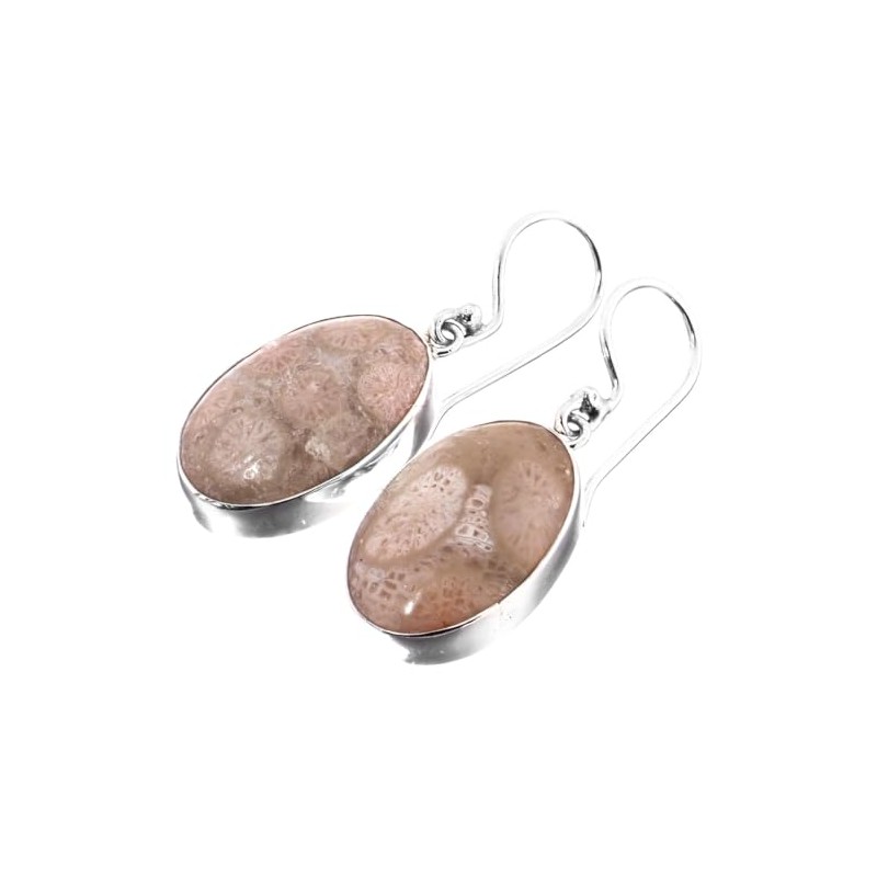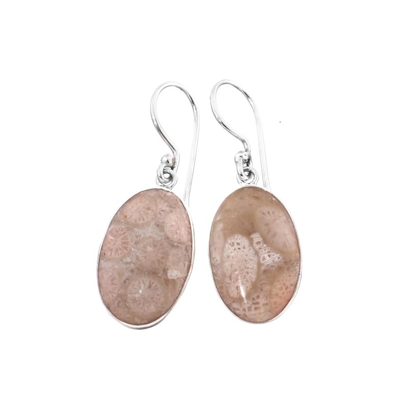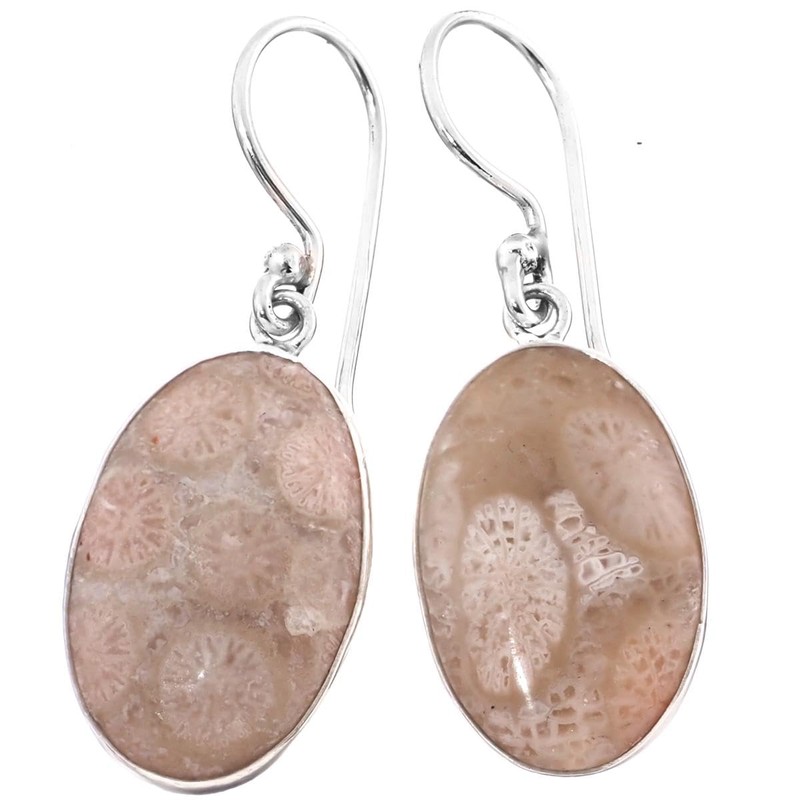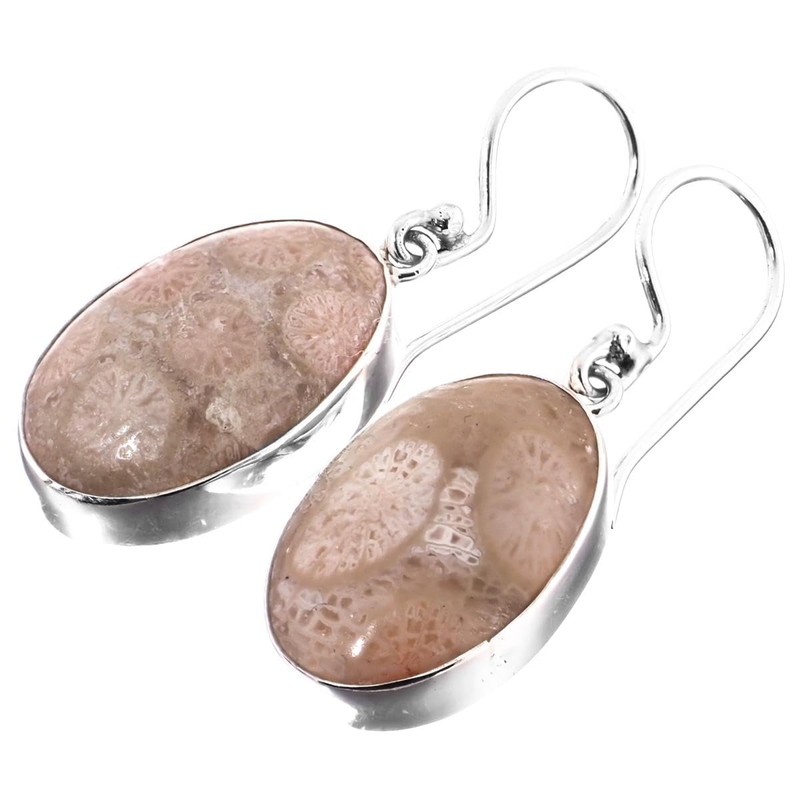 Genuine Fossil Coral Flower Patterned 925 Sterling Silver French Wires Earrings, 1 3/16" p80086