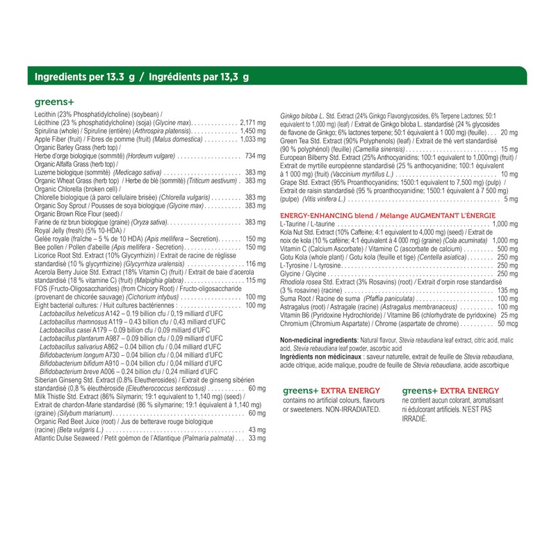 • Each convenient daily serving of Greens+ extra energy in our delicous, invigorating orange flavour contains no artificial flavours, colours or sweeteners. Free from gluten, dairy and GMO's. Keto & paleo-friendly.