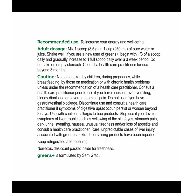 • Adult Dosage: Mix 3 tsp (8.5 g) in 1 cup (250 mL) of pure water or juice. Shake well. If you are a new user of greens+, begin with 1 tsp daily and gradually increase to 3 tsp daily over a 3 week period. Do not take on empty stomach. Consult a health care practitioner for use beyond 3 months.