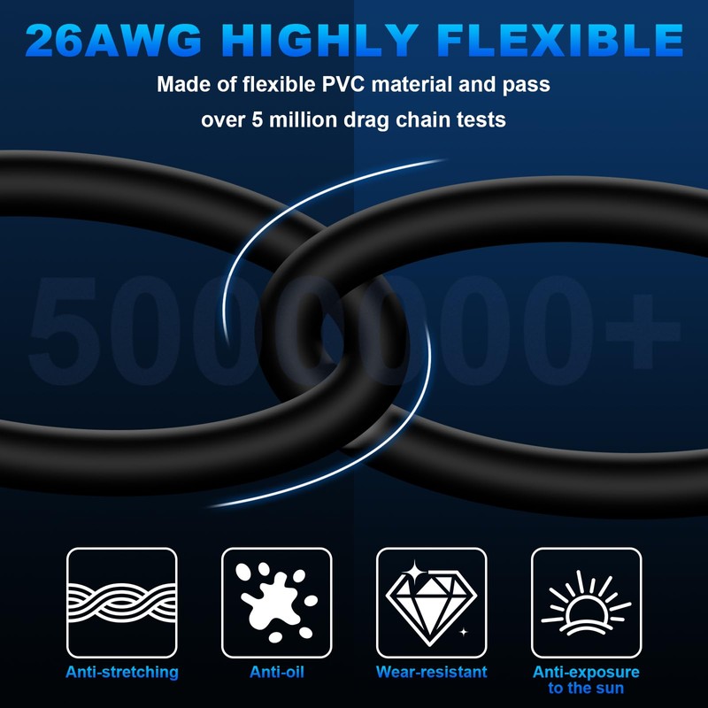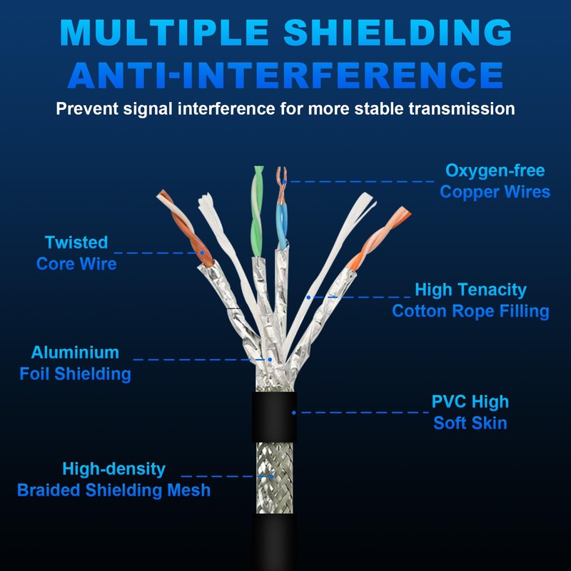 - Sturdy and Highly Flexible PVC Cover; The outer layer of this Ethernet cable is made from flexible PVC material; It’s resistant to stretching, oil, wear, making it the perfect solution for demanding environments, while ensuring longevity and reliability