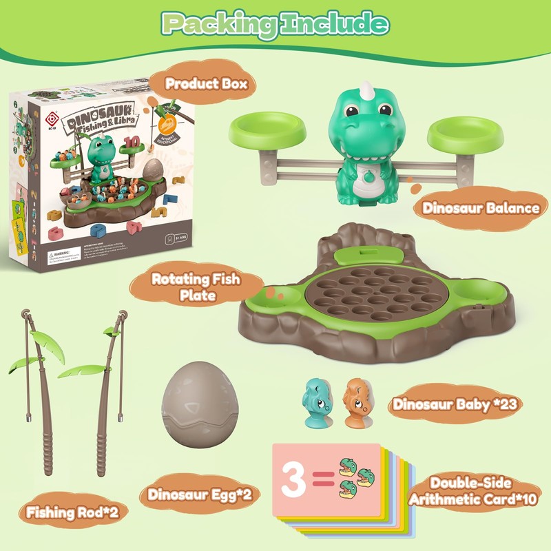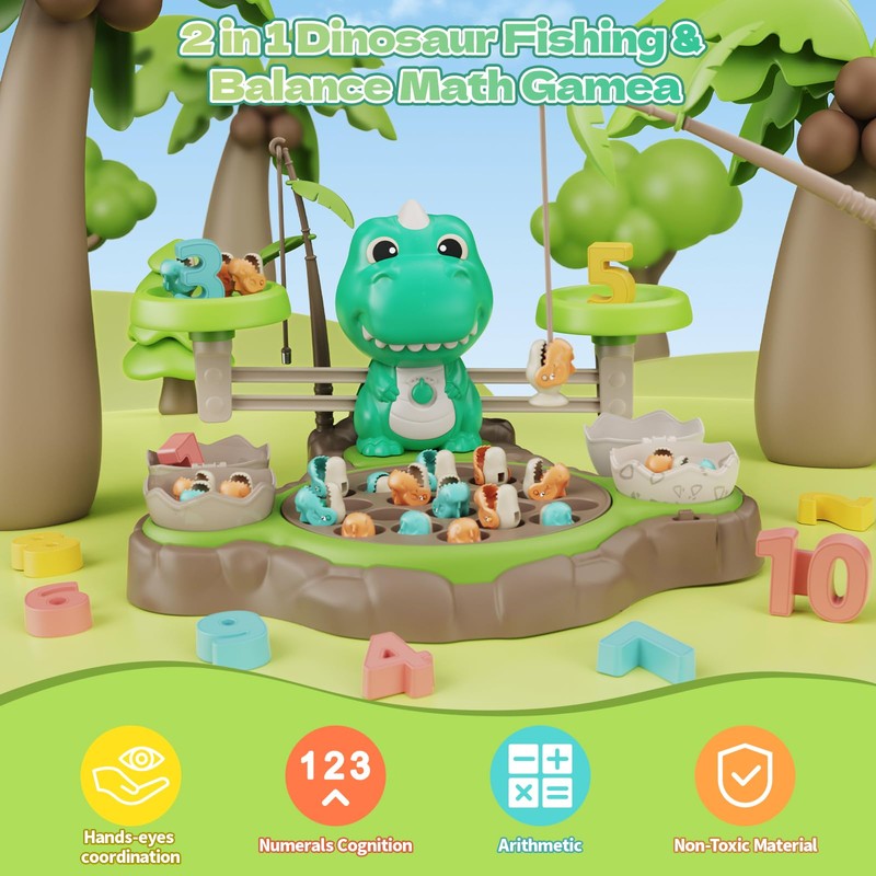 - [2 IN 1 DINOSAUR FISHING BALANCE TOY]: This educational toy helps preschoolers childs improve hand-eye coordination and fine motor skills through fishing. The balance scale allows kids to compare the number of dinosaurs with number weights, helping them easily grasp concepts of size, addition, subtraction, and balance