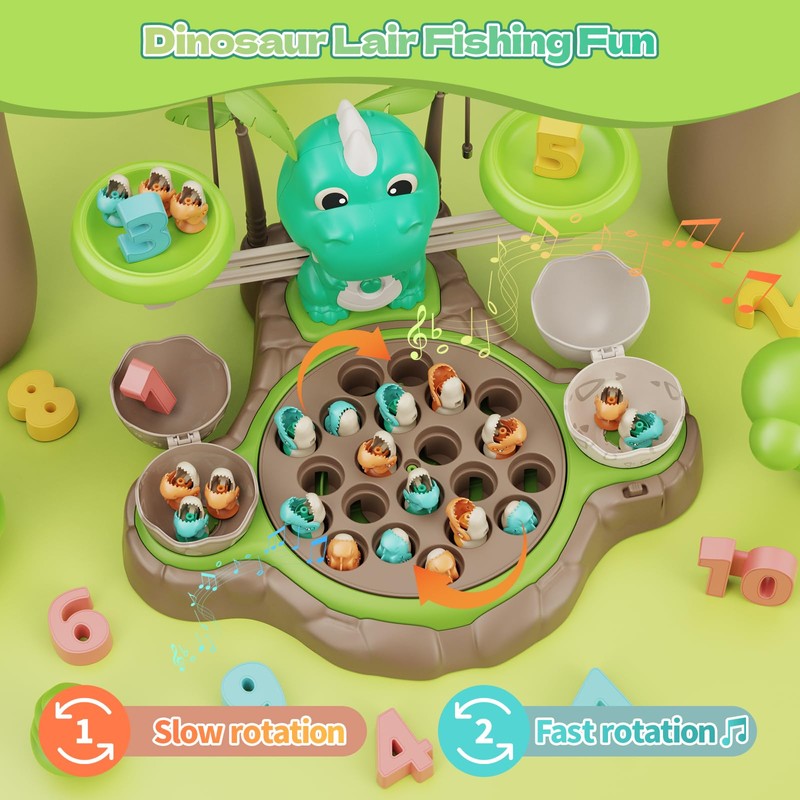 - [FISHING ROTATING TRAY]: Our dinosaur fishing game features a rotating tray with two speed settings—level 2 includes playful music. As the dinosaurs open and close their mouths while spinning, it adds a fun challenge to the game, sharpening children’s hand-eye coordination. This engaging and delightful family toy creates an atmosphere of joy and learning, encouraging kids to stay focused and develop skills while having fun