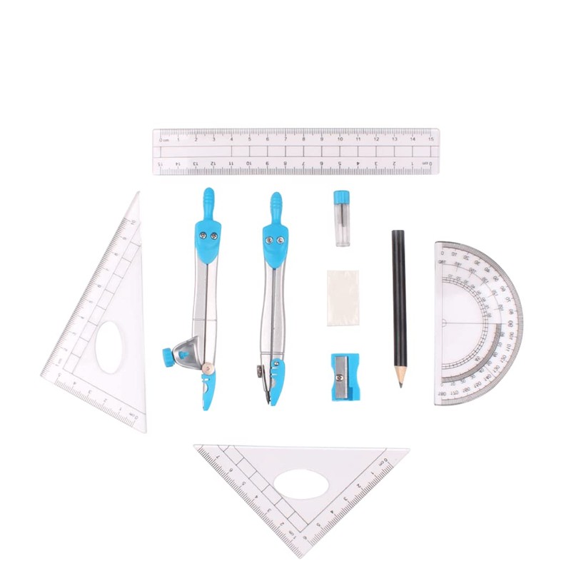 Geometry Set, 10-Piece Compass School Maths Angle Stationery Kit Rulers Educational Drawing Set for Students in Mathematics and Engineering in Carry Bag Blue