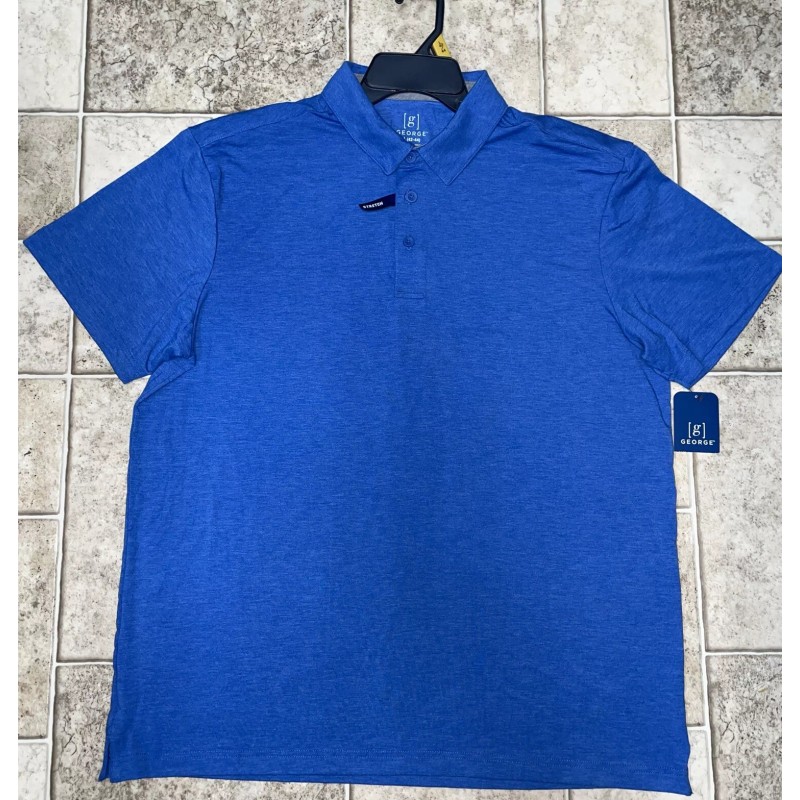NWT Mens George Stretch UF Gator Blue Heather Polo Golf Shirt Size Large 42-44. Solid blue heather color. Pull over short sleeve collard with 3 buttons down the front for comfort. Stretch. Very soft stretchy poly/rayon/spandex material.