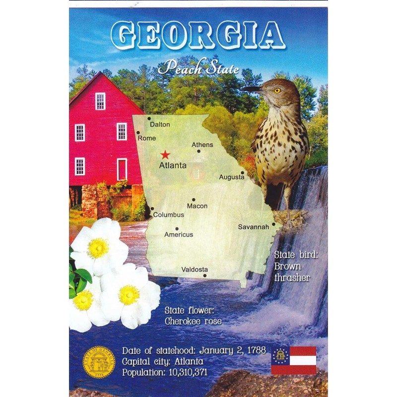 STATES3GEO - GEORGIA - Peach State, Capital: Atlanta, Population: 10, 310,371 - State Bird: Brown Thrasher, State Flower: Cherokee Rose - A U.S. State POSTCARD from HibiscusExpress