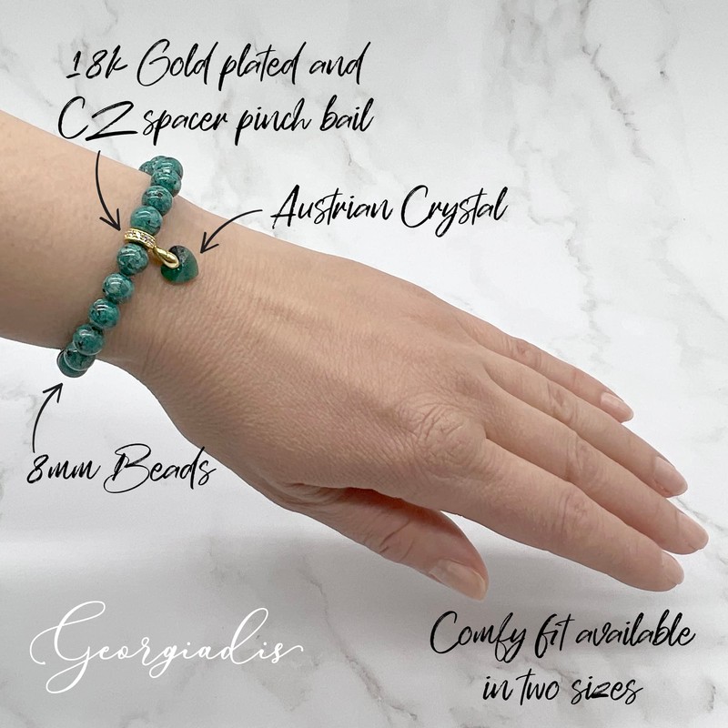 { Georgiadis } - 8mm Bead Natural Marble Gemstone Bracelet with Austrian Crystal Heart Charm, 18K Gold Plating, Healing Stone, Self-Empowerment, Grounding and Increase Abundance, Gift, Love, Bracelet for Women (Green, 18.5cm)