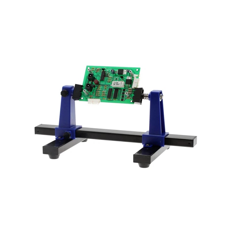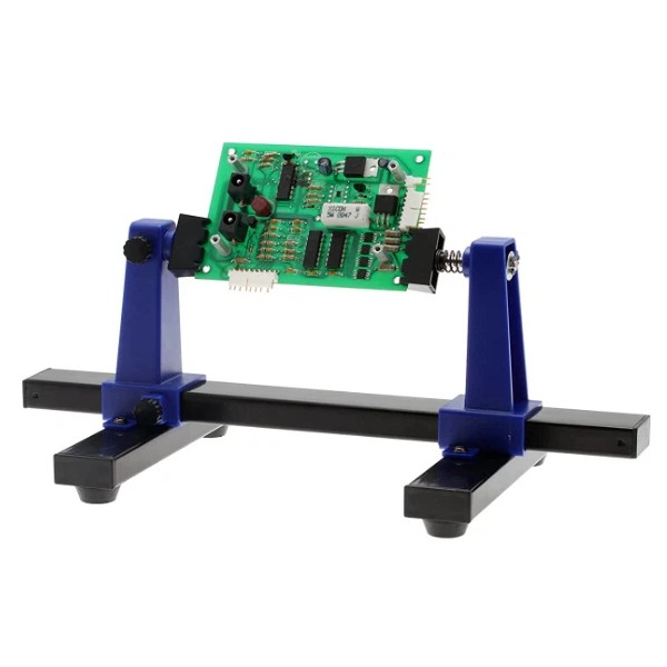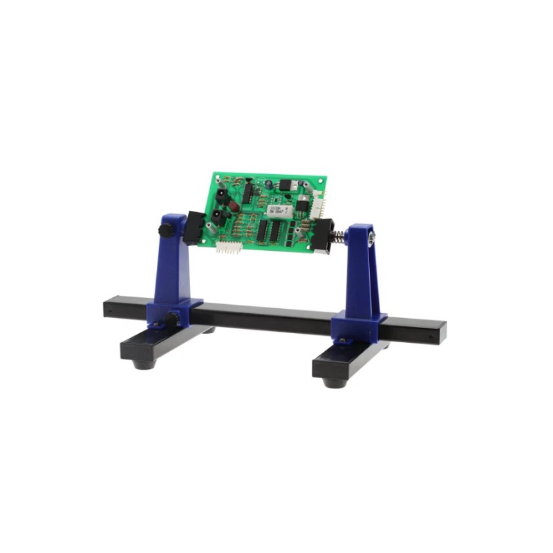 The Adjustable Circuit Board Holder is ideal for clamping PCB for soldering, desoldering or rework. It features 2 adjustable grips on a retractable stand to accommodate various board sizes up to 198mm wide and up to 4mm thick. The adjustable clamps allow the PCB to rotate 360 degrees and stay set in any position. The base of this rigid metal stand features four rubber feet to ensure stability.