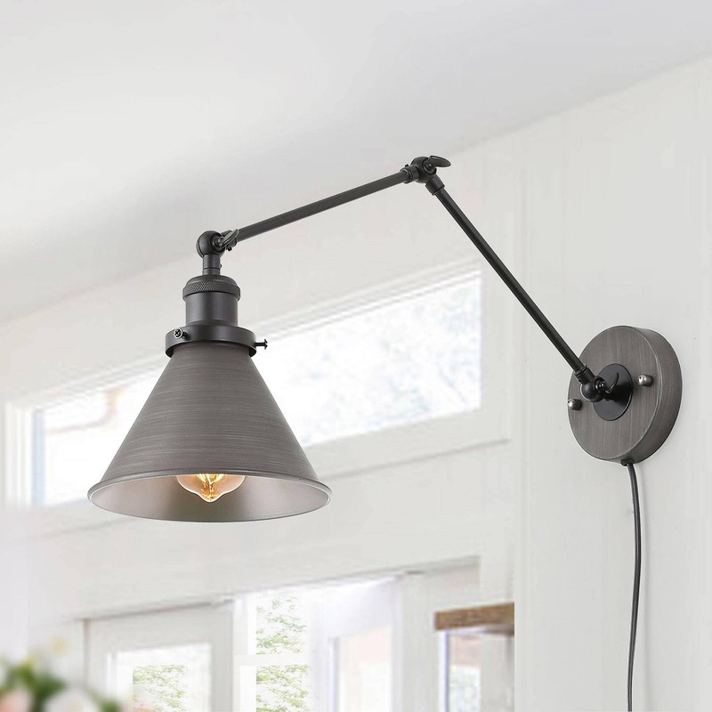 - IDEAL SIZE FOR ANY ROOM: The wall sconces feature two adjustable swing arms and a movable conic shade with a unique brushed silver-black finish. This wall sconce lighting includes 2 x 10.3” arms that can extend to 20.6” in total, making it the perfect size for any corner. The metal shade is 7.3” in diameter x 8.3” in length, offering you maximum light and aesthetic feeling. The canopy comes in a standard 4.7” in diameter and 1" in height, designed to fully cover the standard size of the junction box.