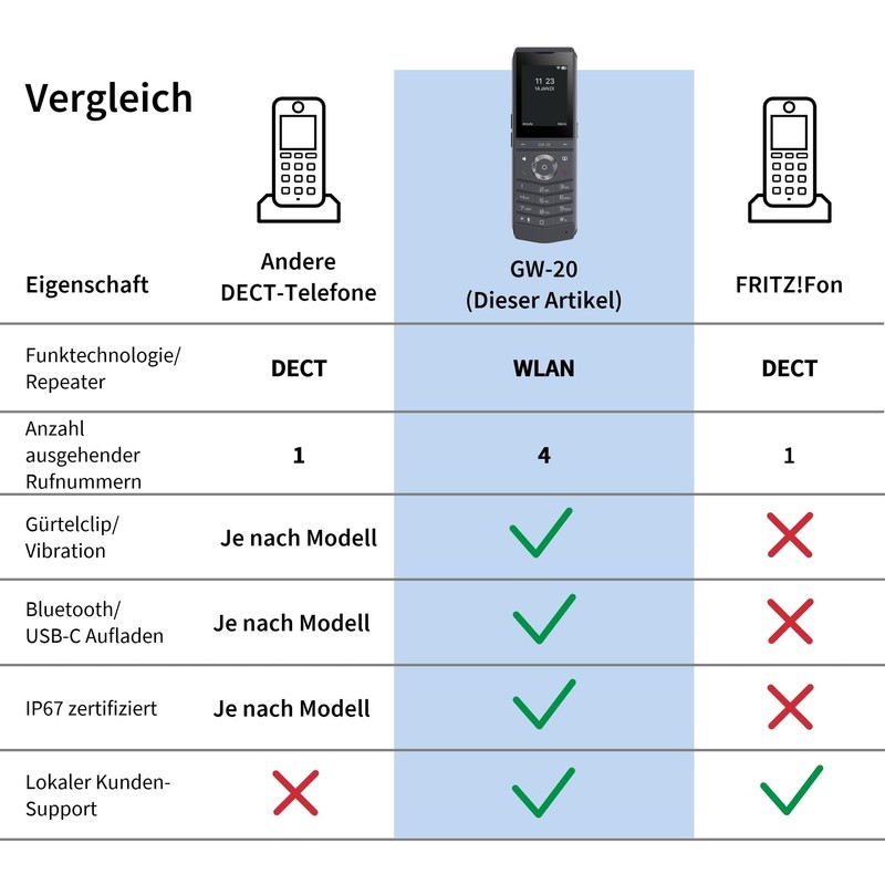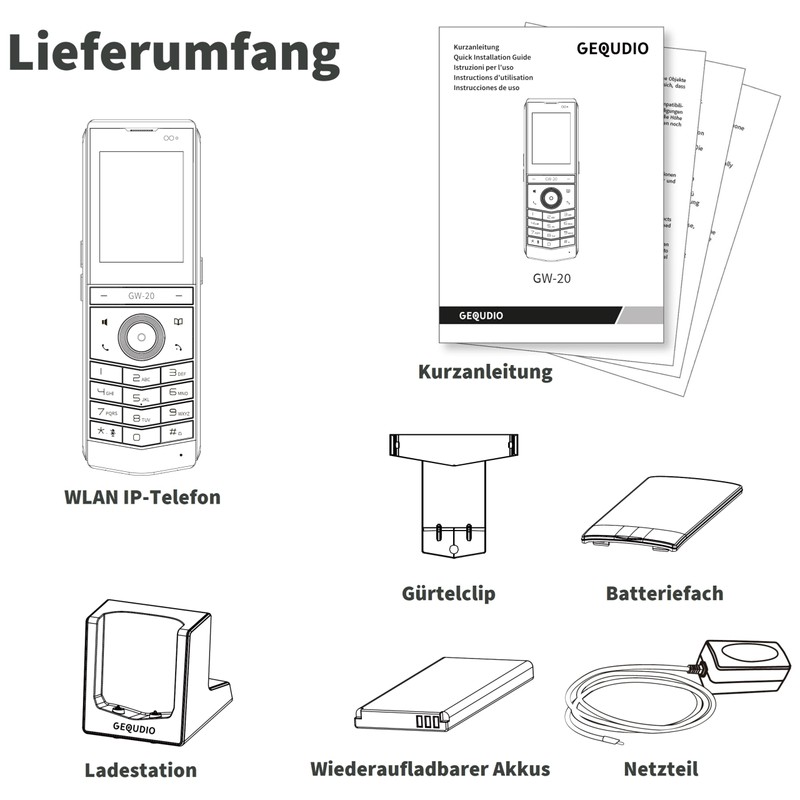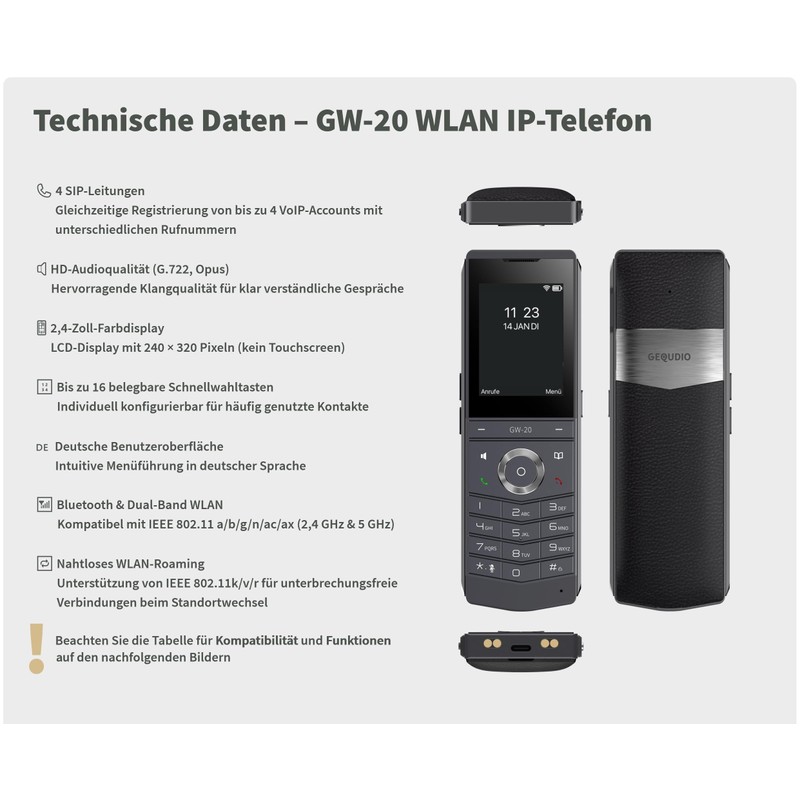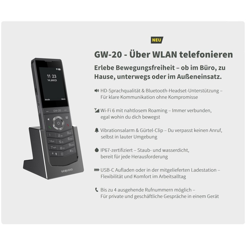 GEQUDIO GW-20 Wireless IP Phone with Charging Cradle for Fritzbox, Telekom, SIP Compatible - Premium Hands-Free Calling & Bluetooth - Dual Band Wi-Fi 6 with WLAN Roaming IP67 Waterproof (GW-20 with
