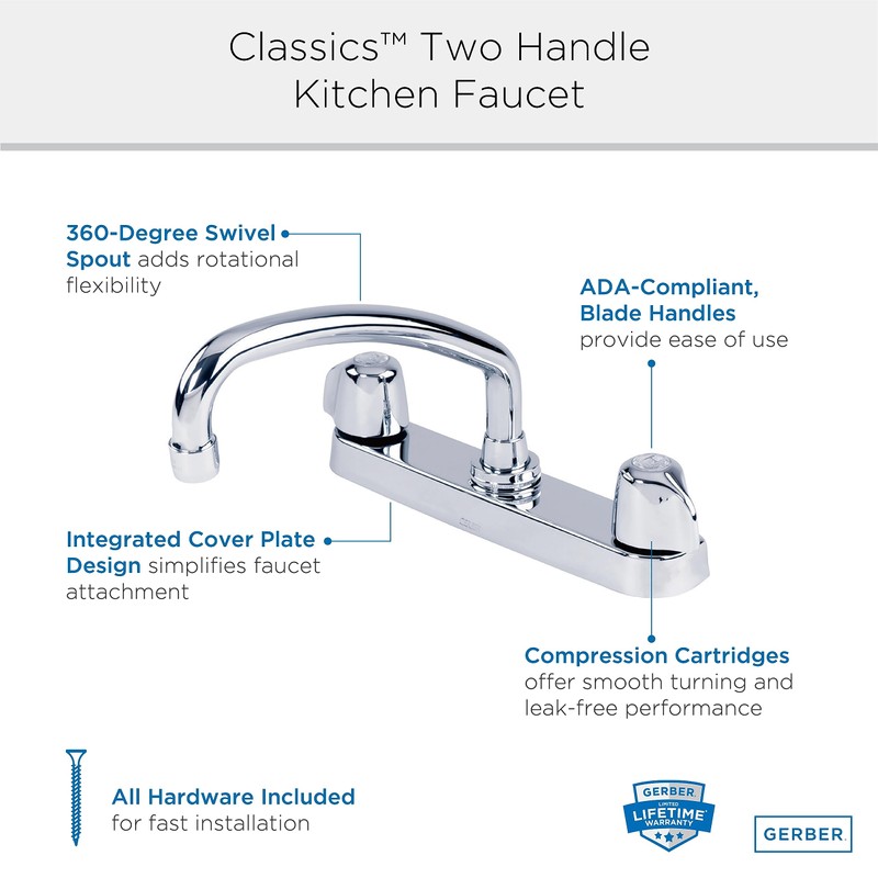 - Durable and reliable, Gerber Classics Two Handle Cover Plate Mounted Kitchen Faucet features a simple low arc spout with a gleaming Chrome finish.