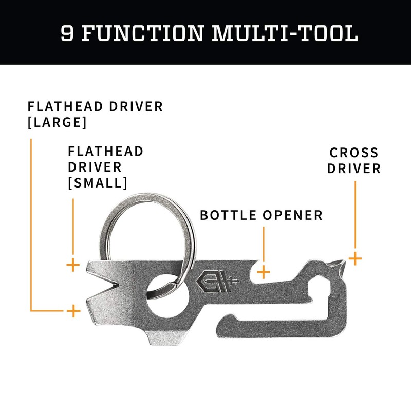 - 9-IN-1 KEYCHAIN AND MULTI-TOOL: Features a pry bar, nail puller, scraper, bottle opener, small flathead driver, large flathead driver, 1/4" hex driver, wire cutter/stripper, cross driver, and belt loop hanger