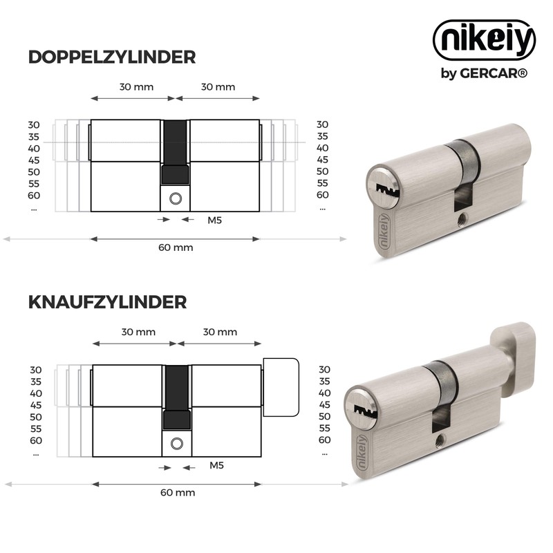 - High-quality heavy design – matt nickel-plated. Enjoy more safety without costly retrofitting of expensive safety devices. With our profile cylinder from GERCAR you are on the safe side. Available in double cylinder or knob cylinder, multiple sizes available. Meets and exceeds safety class 2 EN 1303:2007+AC:2008 in essential points. More security.
