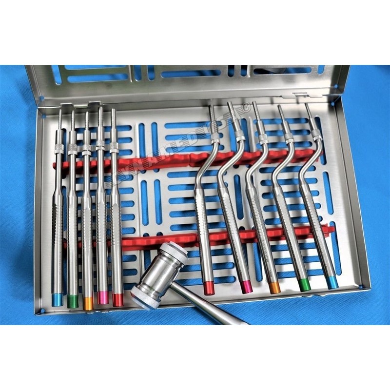 - Deal Includes: - 5pcs Sinus Lift Osteotomes Straight (Concave / Convex) - 5pcs Sinus Lift Osteotomes Off Set (Concave / Convex) - 1pc Solid Stainless Steel Bone Mead Mallet - 1pc Stainless Steel Instrument Sterilization Cassette Sizes: 2.8mm, 3.2mm, 3.8mm, 4.5mm & 5.0mm Depth Markings: 8mm, 10mm, 13mm, 15mm, 17mm & 20mm Color Coded Instruments for identification.