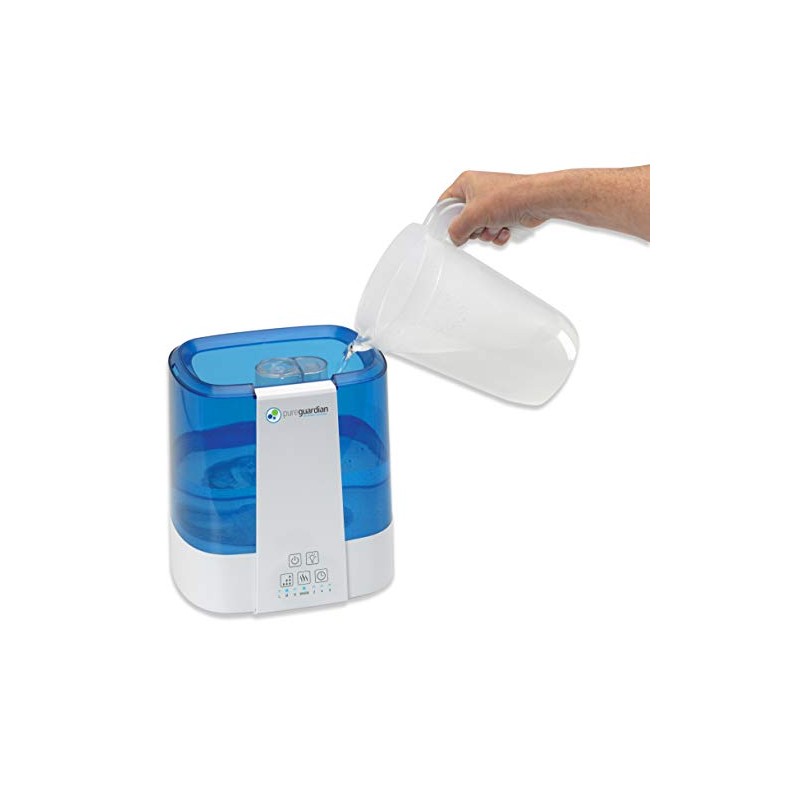 - WARM & COOL MIST HUMIDIFIER: The PureGuardian H5225WCA ultrasonic cool mist humidifier guards against dry air in the home, perfect for those with colds, allergies and dry skin. The easy fill 2 gallon tank covers 560 sq. ft. rooms and runs up to 100 hours