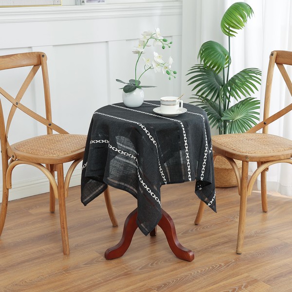 Gernaice Boho Striped Small Square Tablecloth 36x36 Inch, Premium Linen Blend with Cutwork Embroidery, Dustproof Washable Table Cover for Coffee Nightstand Sofa Side End Tables (Black)