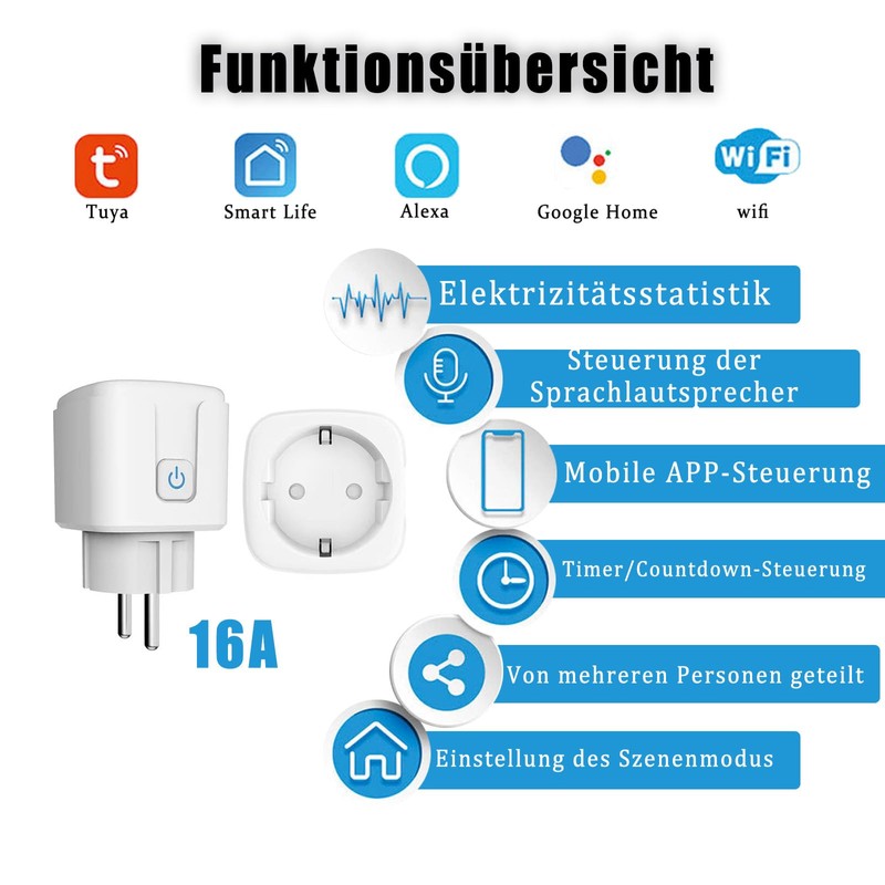 - Easy to set up and safety features of the smart socket: the WiFi socket with current measurement offers safety functions such as overload protection. The smart socket is suitable for all devices under 3680 W (16 A/2.4 GHz). WLAN socket is usually easy to set up. They are simply plugged into a normal socket and then connected to the Wi-Fi network via a smartphone app.