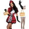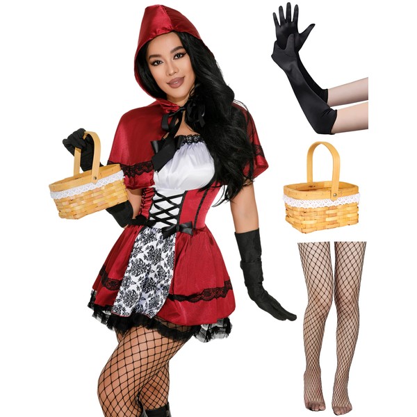 - Red Halloween Costume Dress for Women, 5pcs Full Set includes Satin Dress, Hooded Cape, Black Gloves, Fishnet Stocking, Basket