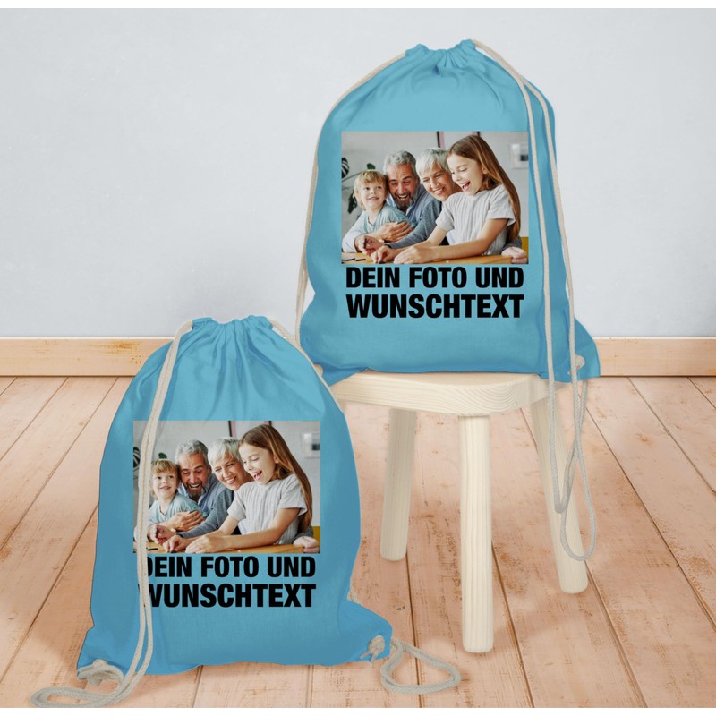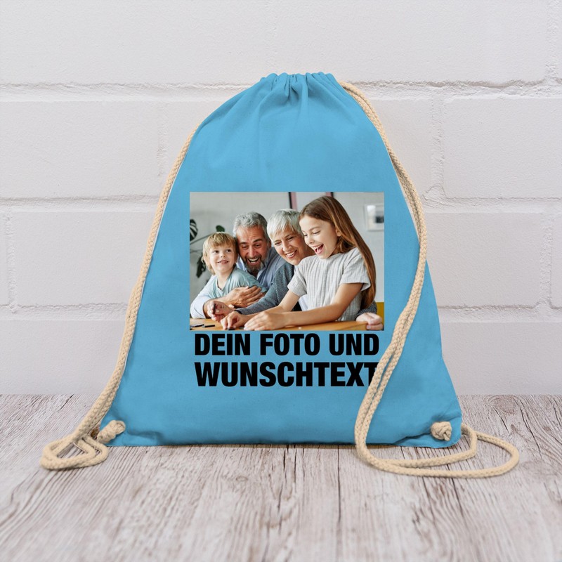 Geschenk mit Namen personalisiert by Shirtracer - Gym Bag Backpack - With Photo I Own Picture I Text I Name I Desired Text, 02 Light Blue