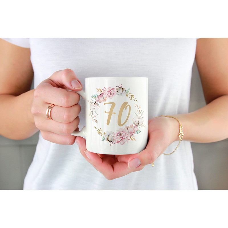 - GESCHENKIDEEN 70 GEBURTSTAG - Die zauberhaften filigranen Blüten auf dem Becher sind eine schöne Alternative oder Ergänzung zum klassischen Strauß. Zwei zarte Ranken mit stilvollen Details umgeben spielerisch die mittig gesetzte Zahl.