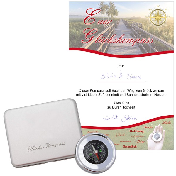 - ✔ In a pretty metal storage tin with engraving "Glückskompass"
