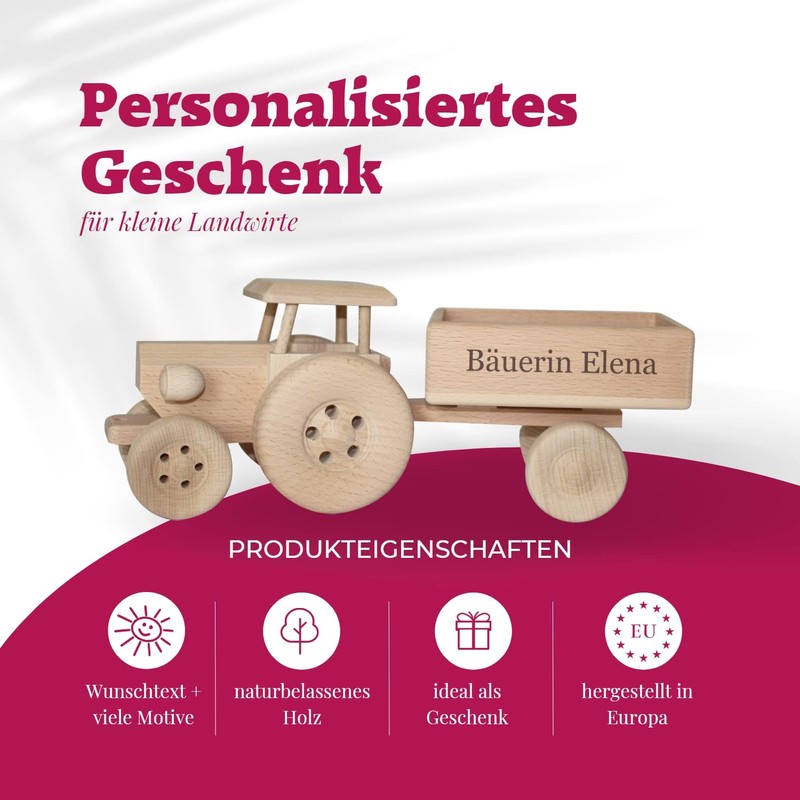 - High-quality children's tractor with trailer made of solid wood. Smooth wood and rounded edges ensure safe fun when the tractor is used as a toy. No plastic, no chemicals. Engraving from our gift workshop in Bavaria.