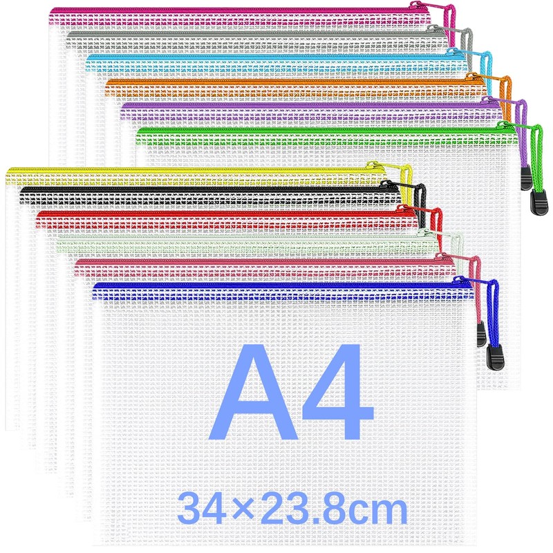 GESDYO 12 Pcs A4 Plastic Zip Wallets Clear Plastic Wallets Mesh Bag with Zip for Documents Suitable for School, Office, Travel, Home, All Kinds of Document Storage