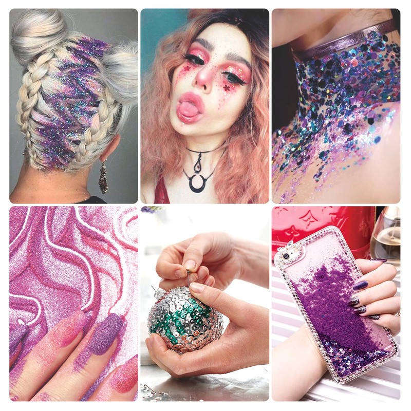 - 【Vielseitig für Haare, Gesicht und Körper】 Gehen Sie über den einfachen Körperglitzer hinaus! Verwenden Sie es, um atemberaubende Glitzersträhnen zu kreieren, Wangenknochen für einen Glitzer-Glanz im Gesicht hervorzuheben oder Arme und Dekolleté für Konzerte zu dekorieren. Die feine Textur eignet sich sogar für Nailart, DIY-Bastelarbeiten oder die Aufwertung von Festival-Haaraccessoires wie Clips und Stirnbändern.