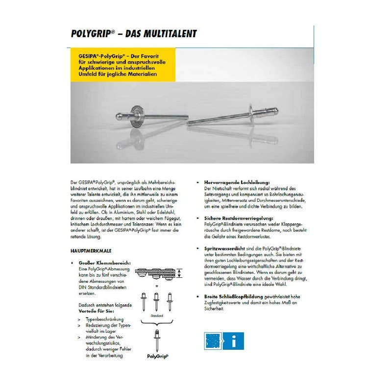 - The great advantage: thanks to its large clamping range, a PolyGrip blind rivet can replace up to 5 different dimensions of DIN standard blind rivets