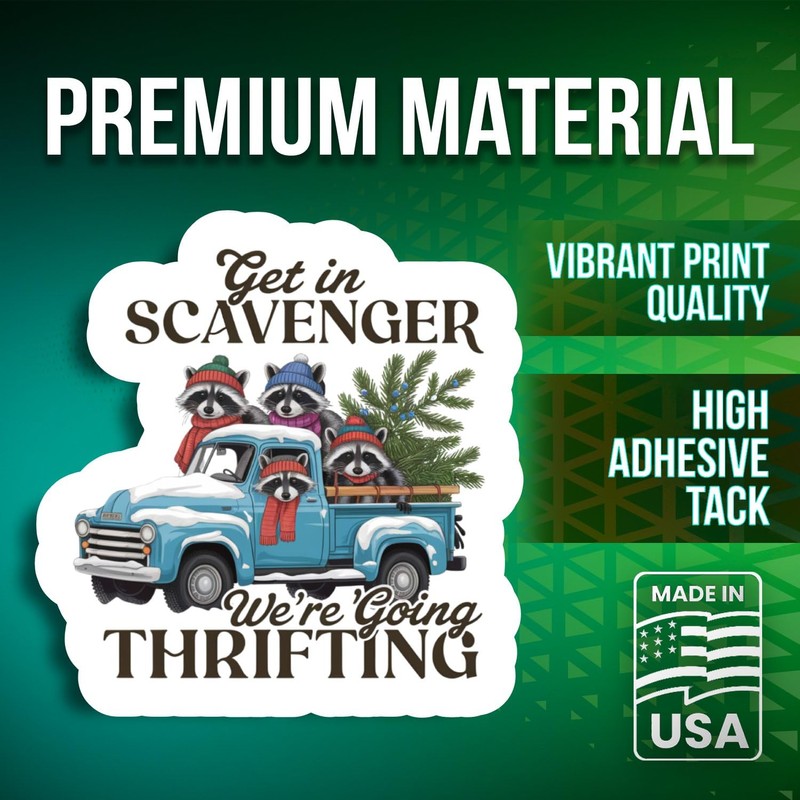 Get in Scavenger We're Going Thrifting Stickers - 5" On Longest Side - Raccoon Feral Nocturnal - 2 Pack - High Adhesive Tack - Bumper Stickers for Cars, Truck, SUV - Made in USA - PLDFS2577