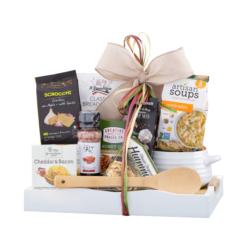 - BE YOUR RECIPIENTS SOUP-ER HERO: This delicious gift is fun to give and so easy for your recipients to serve and enjoy. Hearty chicken noodle artisan soup mix with old-fashioned homemade flavor and plenty of noodles will take the chill out of a cold day; Nonni's mozzarella cheese swirls, hot honey crunch mix, hummus, sesame crackers and lightly salted peanuts are the perfect complements