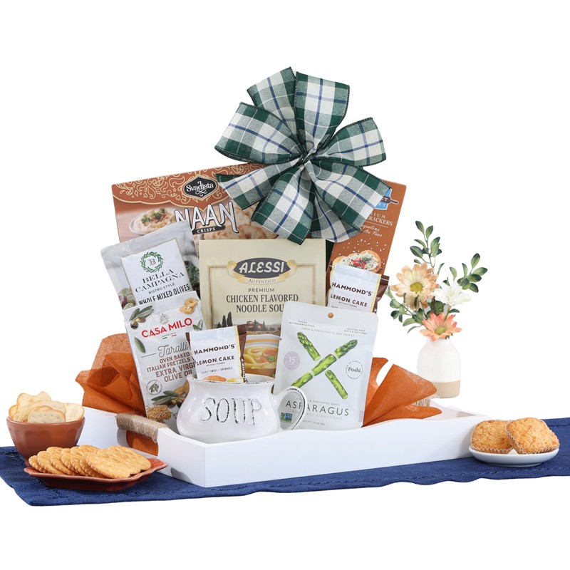 - BE YOUR RECIPIENTS SOUP-ER HERO: This delicious gift is fun to give and so easy for your recipients to serve and enjoy. Hearty chicken noodle artisan soup mix with old-fashioned homemade flavor and plenty of noodles will take the chill out of a cold day; Nonni's mozzarella cheese swirls, hot honey crunch mix, hummus, sesame crackers and lightly salted peanuts are the perfect complements