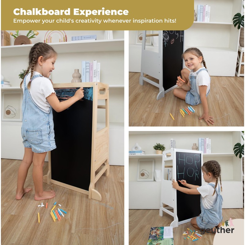 - MULTIFUNCTIONAL DESIGN including CHALKBOARD: This toddler standing tower features an adjustable-height platform and foot pedal, making it a versatile toddler kitchen stool for various tasks. With a built-in chalkboard, it encourages creativity, while the hand handles on both sides ensure easy mobility. For extra safety, it includes two front safety bars—one removable with a single click. The rounded edges provide a minimalist, Scandinavian look.