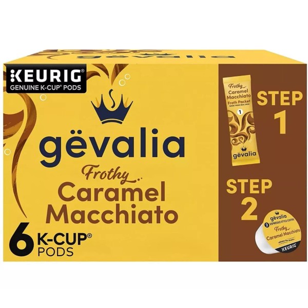 Gevalia Frothy 2-Step Caramel Macchiato Espresso K-Cup Coffee Pods & Frothy Milk. Condition is New. Shipped with UPS Ground Saver.