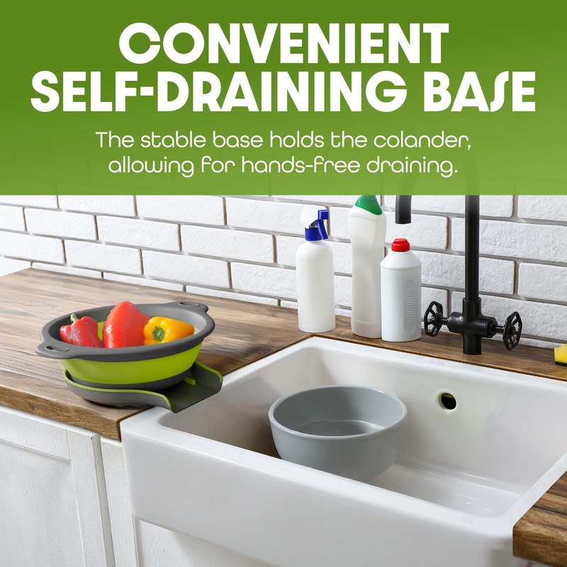 Gevoli Large Collapsible Colander with Self Draining Base - 5Qt Side Drain Food Strainer for Edge of Kitchen Sink, Green (2 Piece Set)