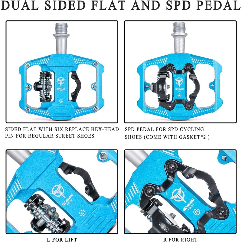 - 【DUAL-SIDED BIKE PEDAL】- A dual-sided bike pedal with a traditional platform on one side; and a SPD step-in design on the other. Use with SPD cycling shoes (come with Gasket*2 ) or go clipless using regular street shoes, 6 Stainless steel anti-skid pins effectively prevent your shoes from sliding off, whatever position you place your feet that’s where they stay on.