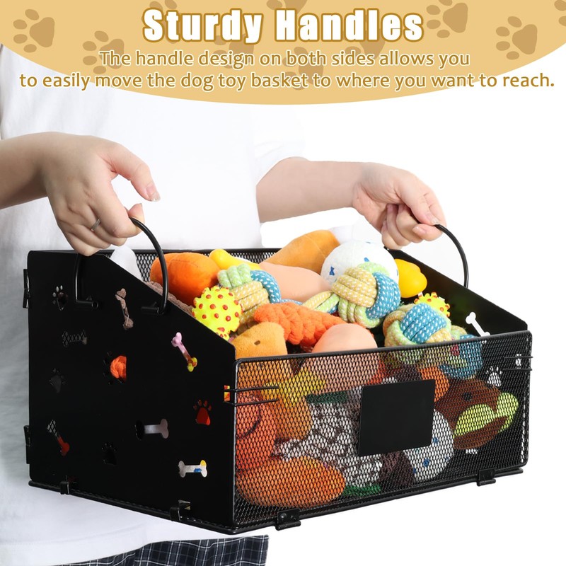 Geyecete Dog Toy Basket Dog Toy Box Dog Toy bin Metal Dog Toy Basket Box with Handles and Label Position Design Large Iron Art Toy Storage Folding