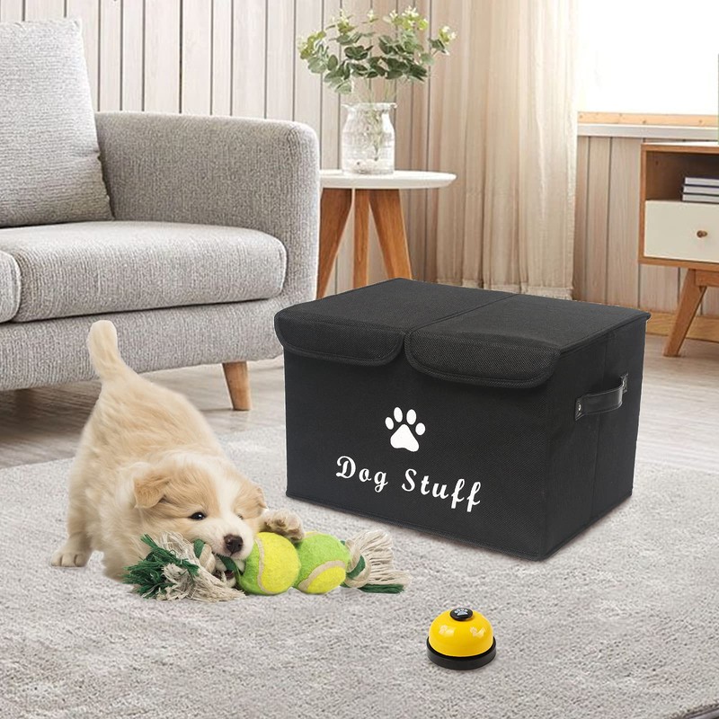 - 4. DOUBLE-SIDED - Front side is Printed with "Dog Stuff", back side has no writing. the storage basket stands upright and the convenient handles make it easy to transport or move when needed.