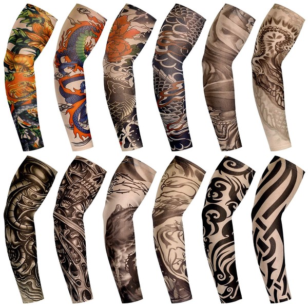 - Package content: 12 different designs of tattoo sleeves, as shown in picture. 1 unit per design and individually packed in bag