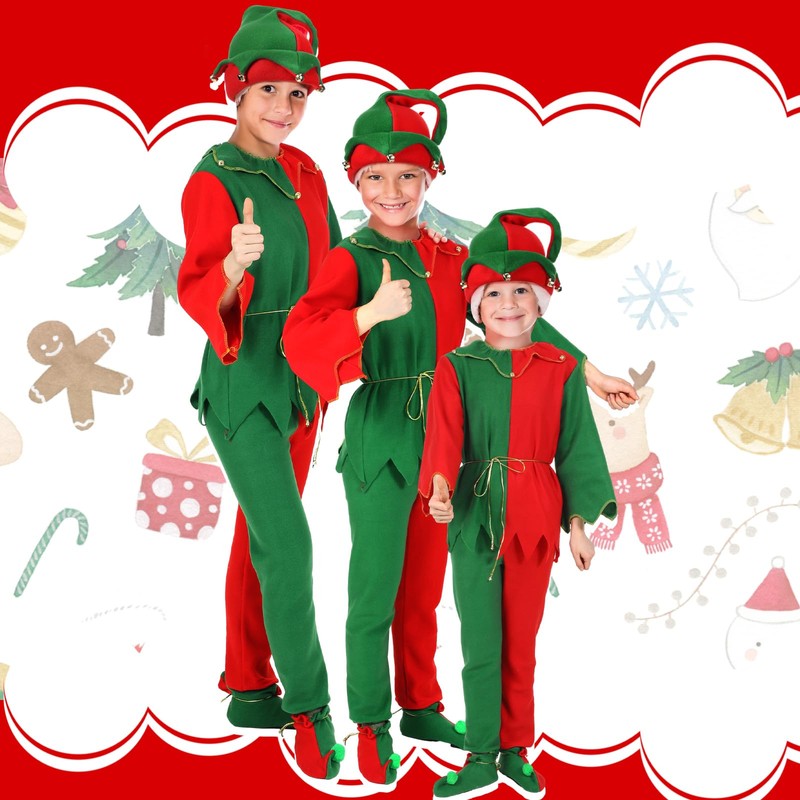- Package Information: you will get Christmas Elf outfits for boys and girls, including Elf suits ,hat, 3 belts and a pair of shoes in red and green; Your children can wear them to attend a Christmas cosplay party