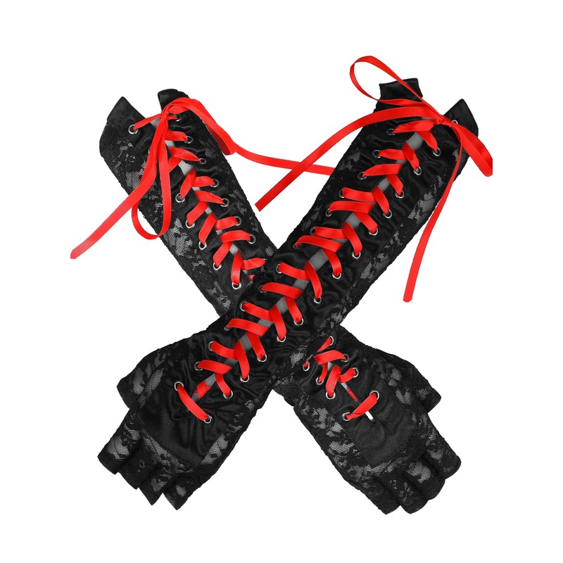 Geyoga Long Lace Fingerless Gloves Women Elbow Punk Flower Ribbon Gloves for Bridal Wedding Tea Party Dance Prom Accessories (Black and Red)