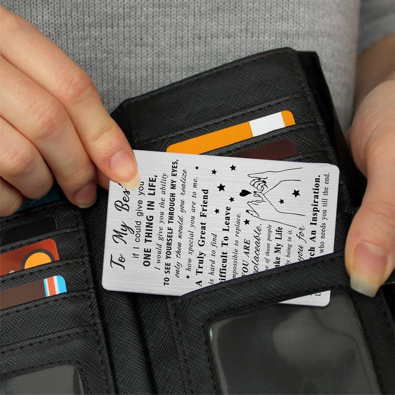 - Bestie Gifts for Women - The i love my bestie wallet card engraved with :" to my bestie, if I could give you one thing in life, I would give you the ability to see yourself through my eyes, only then would you realized how special you are to me. a turly great friend is hard to find, diffcult to leave, impossible to replace, you are irreaplace, you are one of thoes people who make my life better just by being in it, thank you for being such inspiration.Love,the one who needs you till the end.
