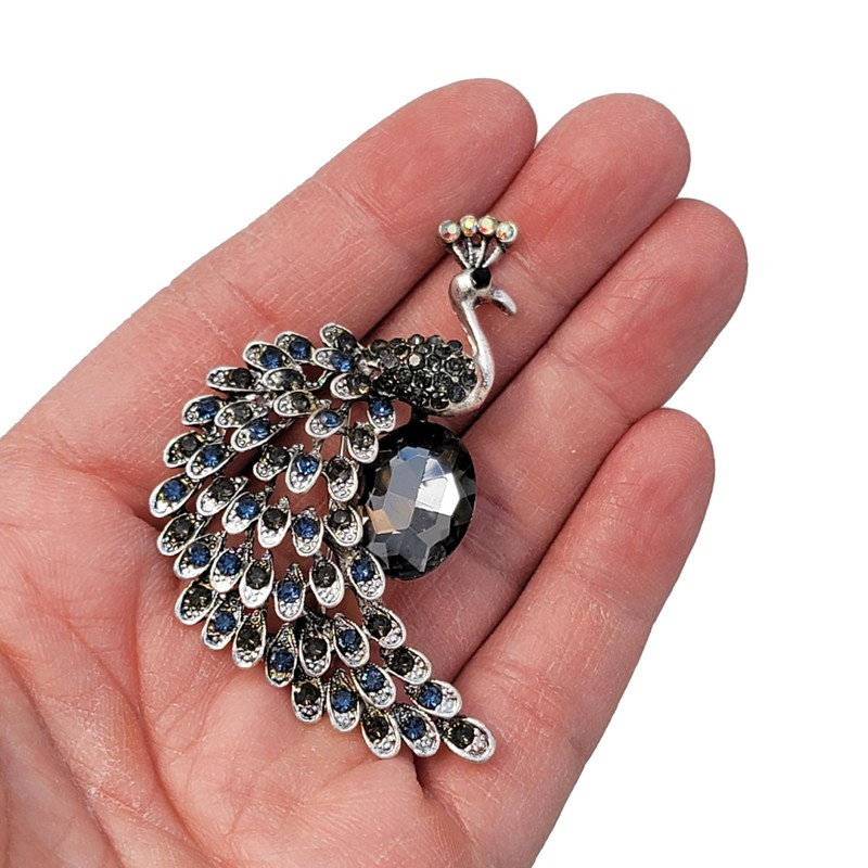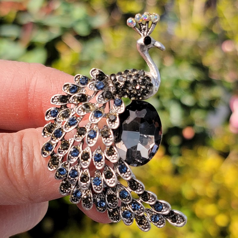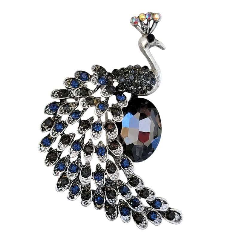 - This exquisite peacock brooch captures the majestic beauty of one of nature’s most stunning creatures. Designed with intricate detail and adorned with shimmering rhinestones and crystals, it sparkles with elegance and charm. Whether in vibrant jewel tones or classic metallics, the flowing tail and graceful shape make it a true statement piece.