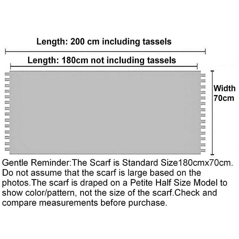 - Approximate dimensions: Length: 180 cm and 10 cm tassels. Width:70cm. This is a standard size scarf offering generous coverage, whether draped loosely around shoulders or wrapped snugly around neck for warmth. Note: This is a standard size scarf. This is not large to cover whole body.