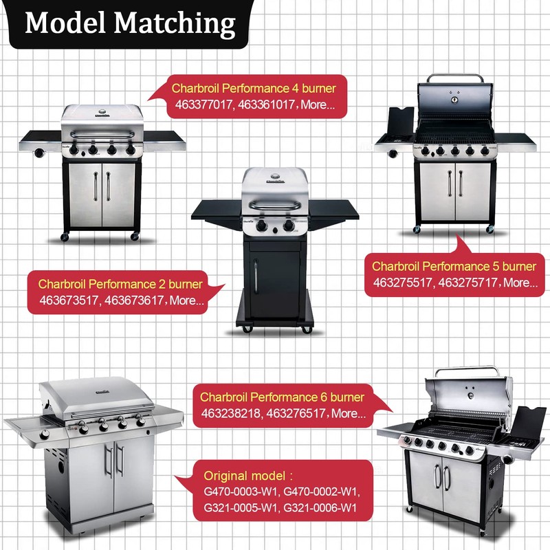 - 【Replacement for Charbroil performance 4 burner models】: 463332718, 463332719, 463335517, 463335519, 463342118, 463342119, 463347017, 463347418, 463349917, 463361017, 463375619, 463376017, 463376117, 463376217, 463377017, 463377117, 463377217, 463377319, 463673617, 466335517, 466339417, 466347017, 466347019, 463376017P1, 463376018P2. ►Orignal Part Number: G321-0005-W1, G321-0006-W1, G470-0003-W1, G470-0002-W1